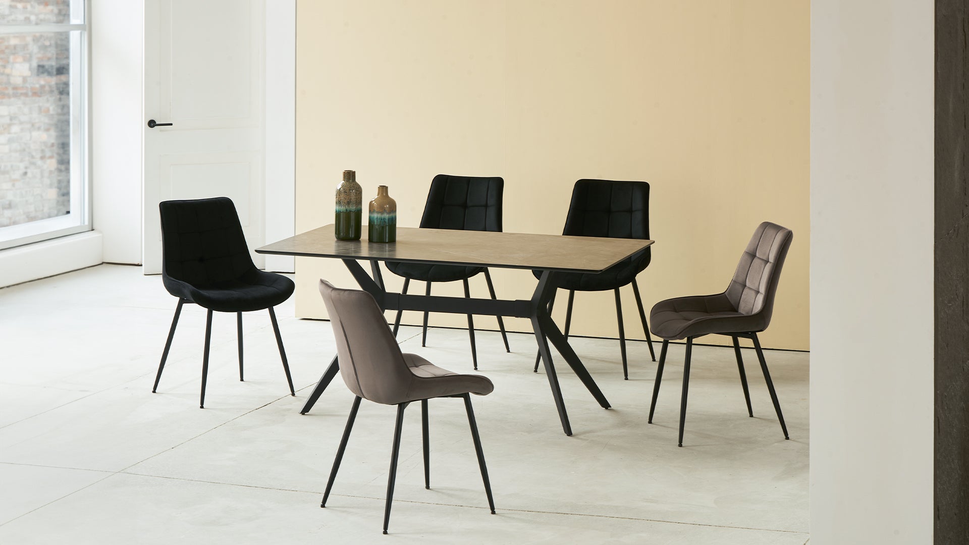 O encosto largo e curvado e o assento acolchoado da Dalila proporcionam suporte excepcional, enquanto as pernas em cromo dourado acrescentam um sofisticado toque designer. Os detalhes discretos de costura nas bordas criam uma silhueta refinada, elevando estas cadeiras acima das comuns cadeiras de jantar em veludo.