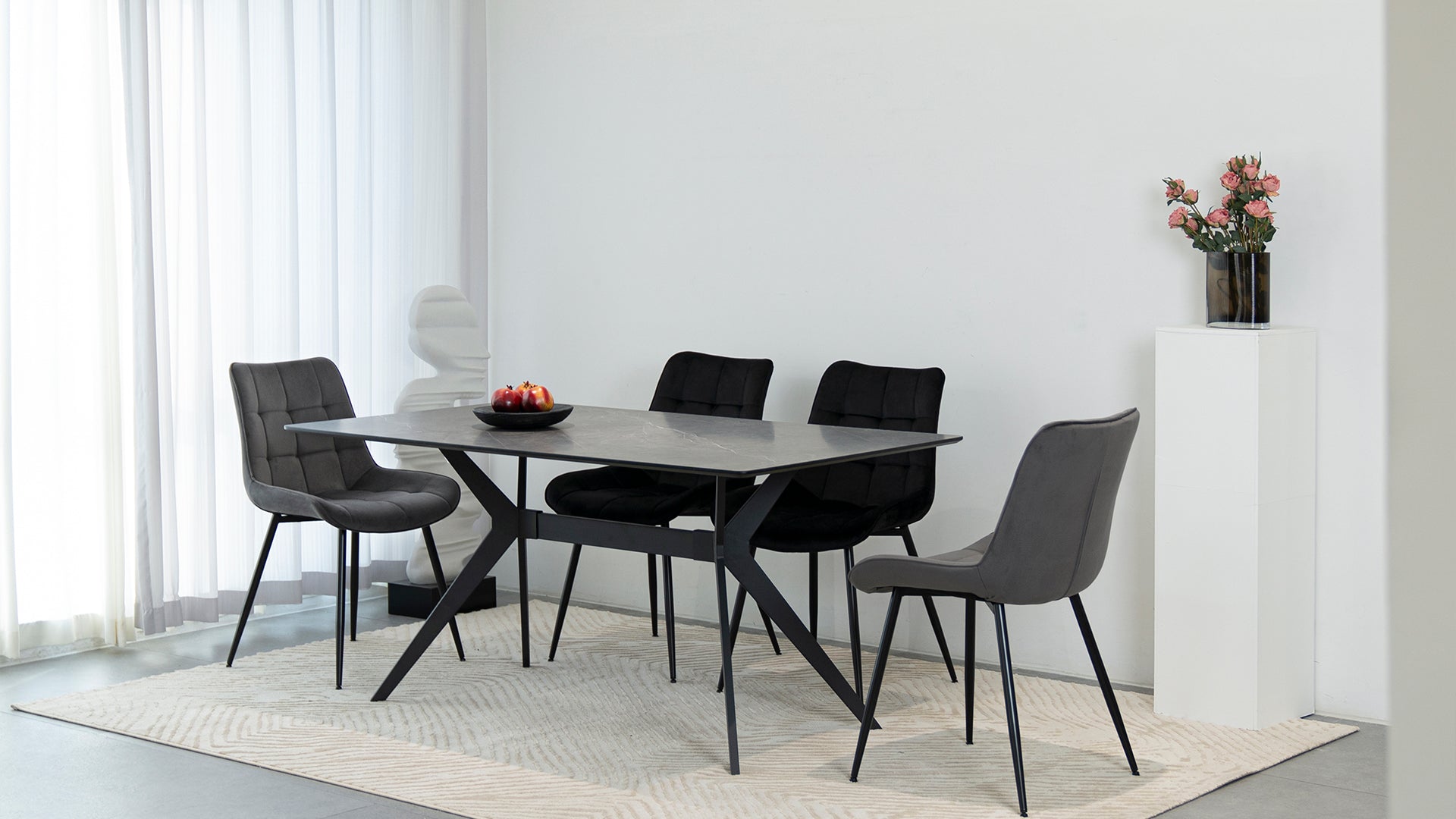 - 【Gemütliche Atmosphäre beim Essen】: Die Kombination aus der tiefgrauen Tischplatte und den modernen schwarzen Metallbeinen schafft eine komfortable und entspannte Essatmosphäre. Es fühlt sich nicht schwer oder bedrückend an und hilft, eine ungezwungene und natürliche Essatmosphäre zu fördern.