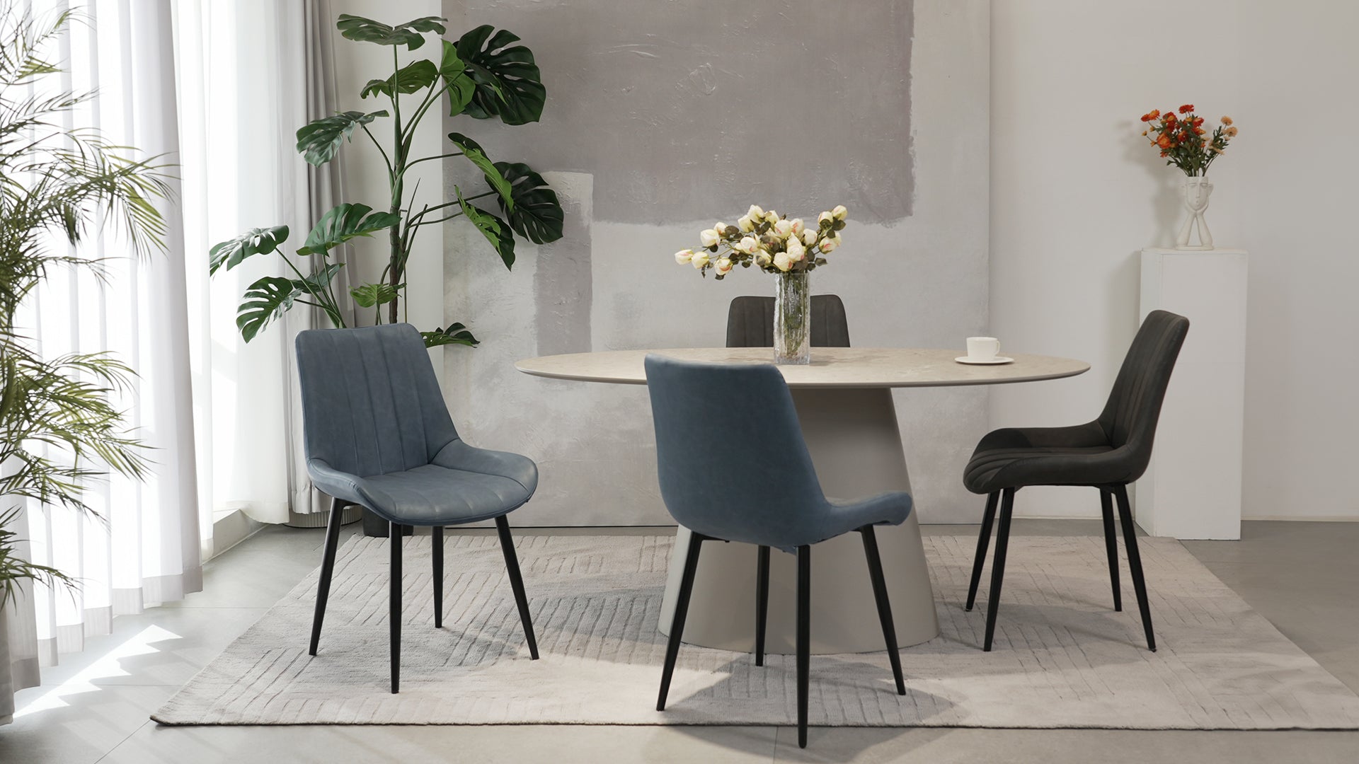 Der luxuriöse Esszimmerstuhl aus Kunstleder ergänzt Ihren Raum und schafft eine Atmosphäre von Komfort, Ruhe und Eleganz. Ein idealer Ort zum Ausruhen und Entspannen für Sie, Ihre Familie und Freunde.
