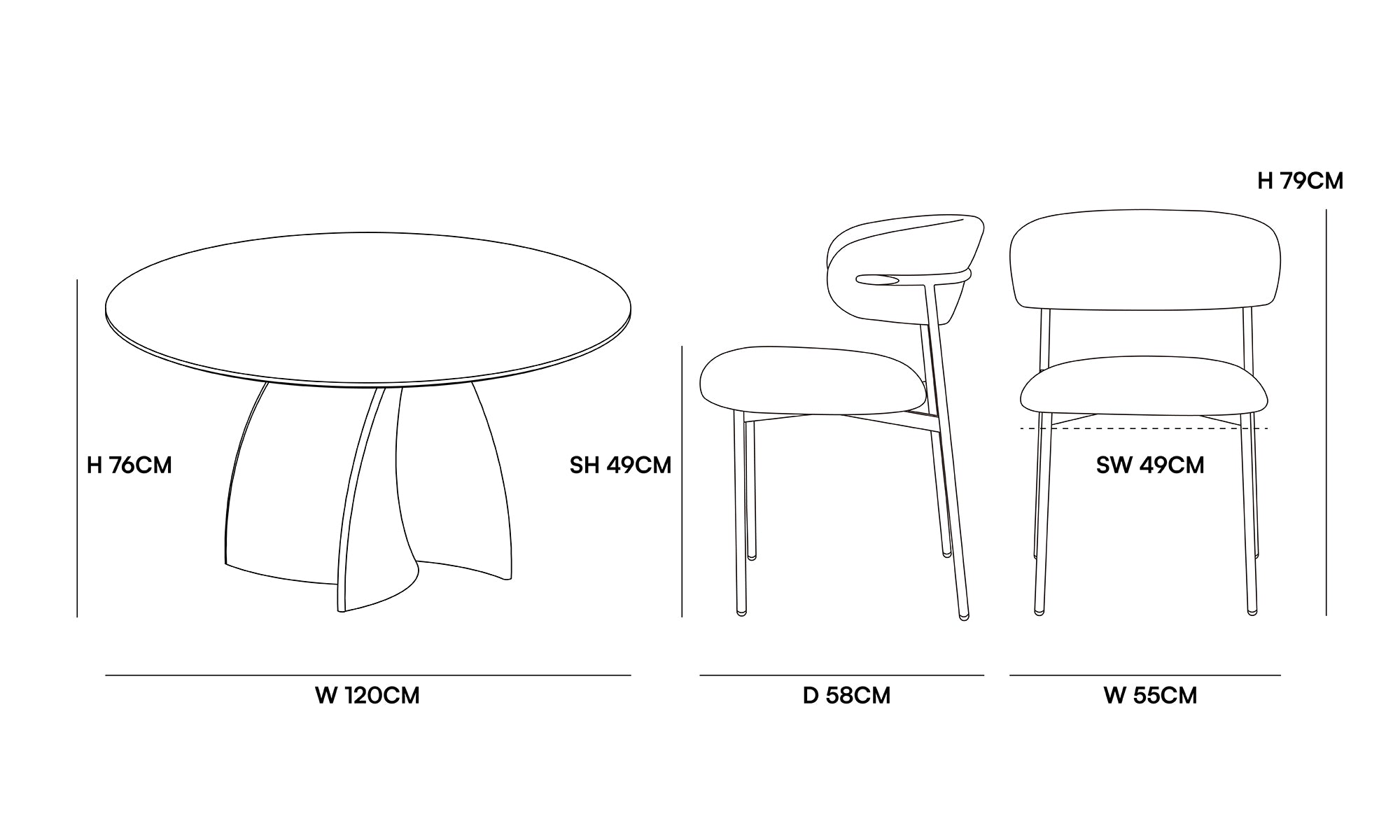 Der runde Tisch Gemma (120 cm Durchmesser) und das 4er-Set Stühle Zahra eignen sich perfekt, um Ihrem Restaurant moderne Eleganz zu verleihen.