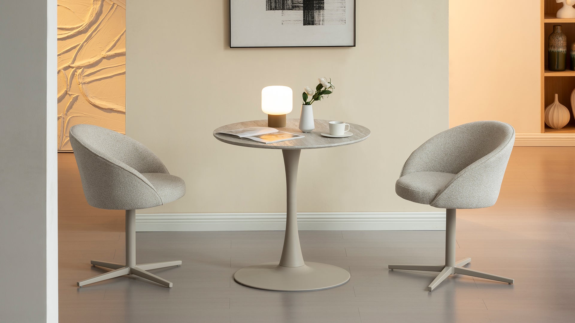 Runder Esstisch Tiana aus Travertin (Ø 80 cm) und 2 um 360° drehbare Esszimmerstühle Paislee mit beigen Metallbeinen