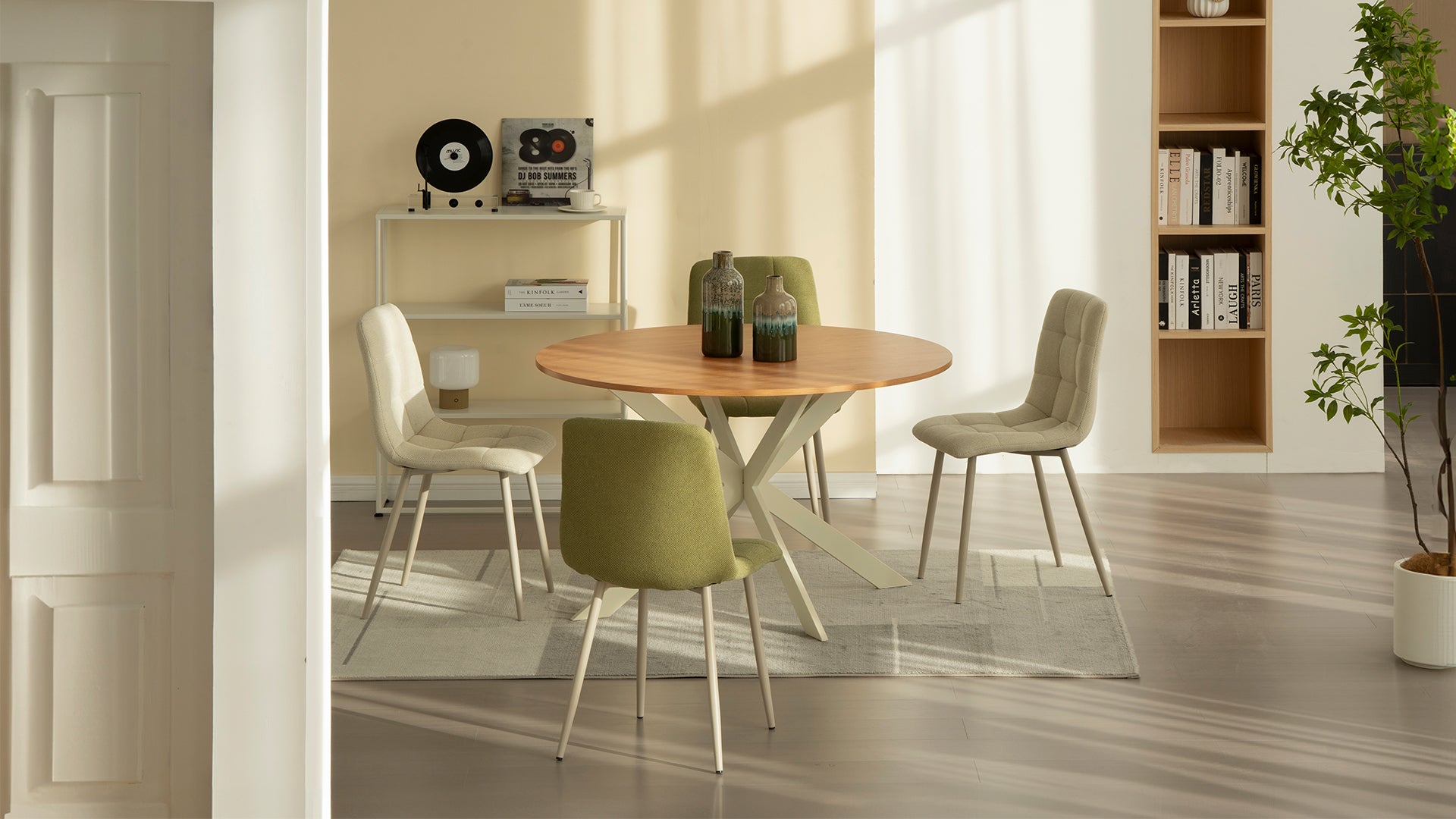 Runder Holztisch Tilly (Ø120 cm) und Stühle Aoife mit Leinenbezug